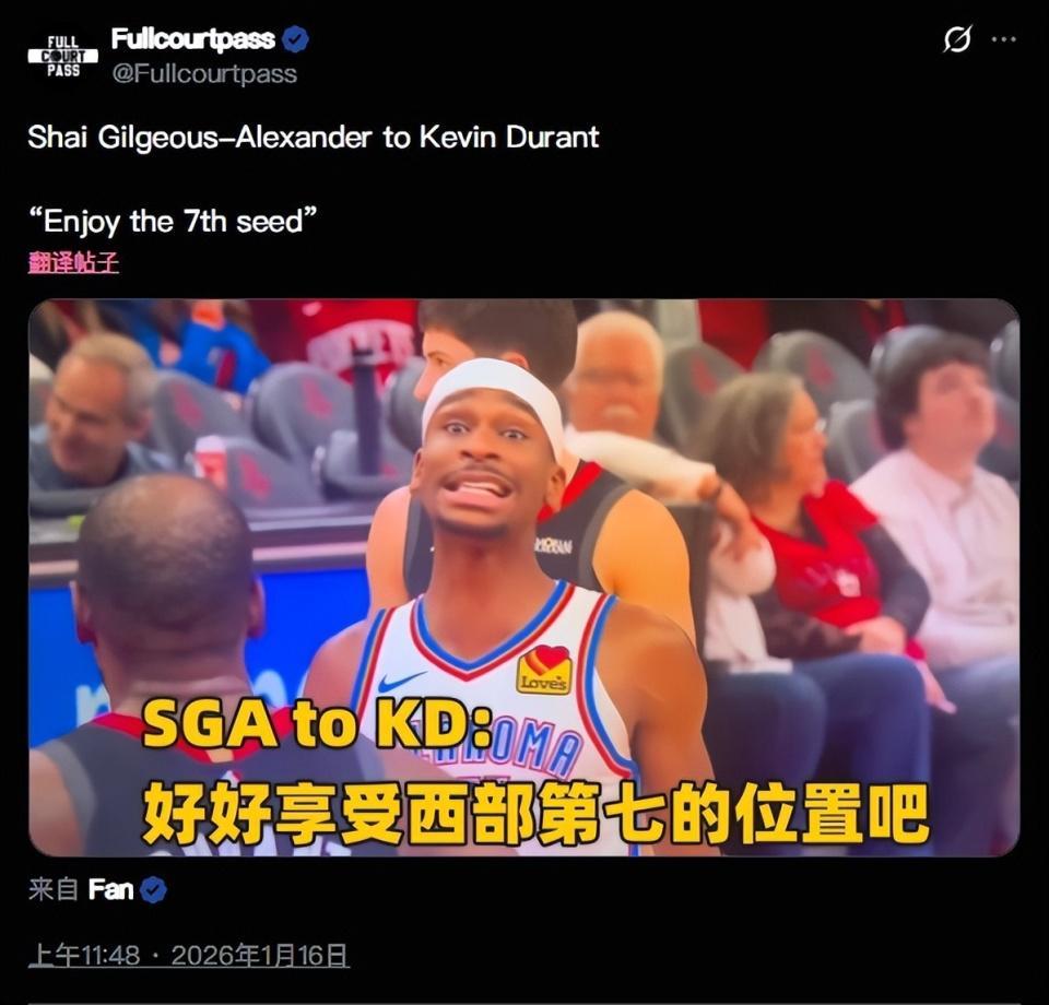 是在比赛过程当中,当胜局已定的时候。亚历山大走上罚球线,一边罚球,一边龇牙咧嘴的,用非常挑衅的表情和语气,朝着杜兰特狂喷:“好好享受待在西部第七的感觉吧。”看亚历山大这个表情,再看他朝着杜兰特方向做出的这个动作,这句垃圾话真的是狠狠的扎心了杜兰特。